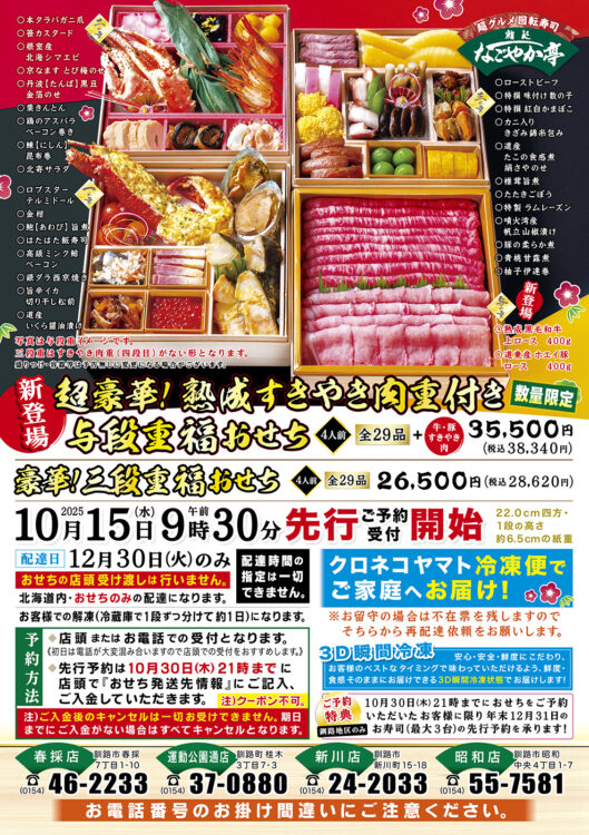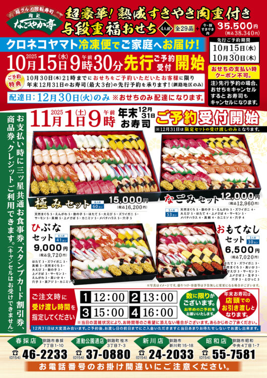 2025.10.04 ご予約帯広なごやか亭『年末おせち・年末お寿司セット』ご予約のお知らせ!