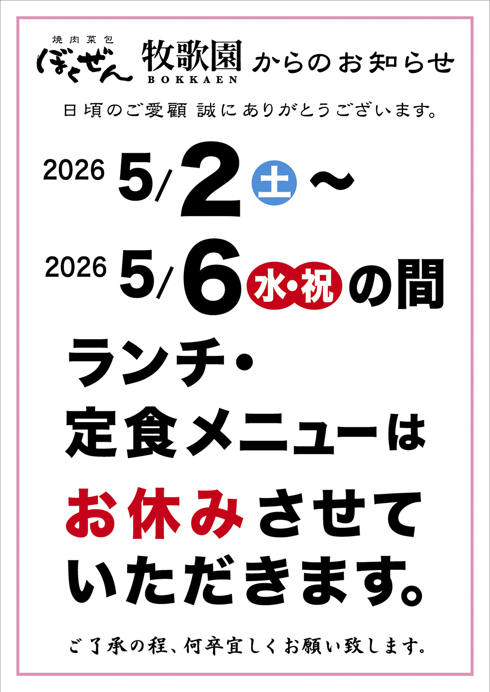 ぼくぜん全店・牧歌園 GW期間 ランチ・定食メニューお休みのお知らせ